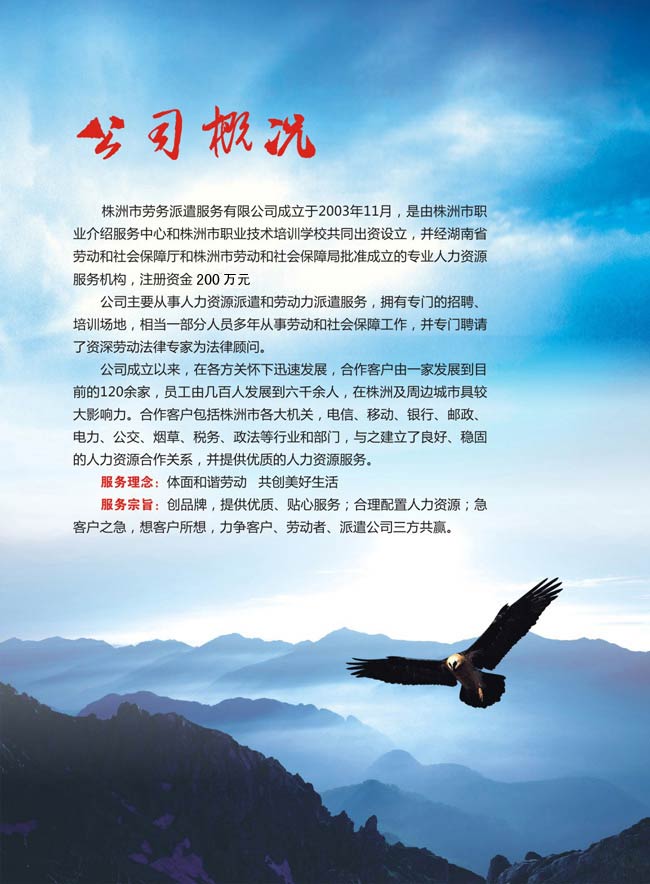 服務(wù)宗旨:創(chuàng)品牌,提供優(yōu)質(zhì)、貼心服務(wù);合理配置人力資源;急客戶之急,想客戶所想,力爭客戶、勞動者、派遣公司三方共贏。
